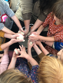 As the days got colder and shorter, we welcomed Fire into our tipi with an ancient method of fire-making, the bow drill. We spent a morning learning about how to build a "house" for a fire to live in, and then how to make a cozy nest for the coal that we would all birth together. When making fire with a bow drill, the friction eventually builds enough heat to create a tiny little coal. This coal needs a very specific environment to grow into a small fire, so part of our lesson each child processed some of the material we needed for our tinder bundle, and then we put it all together to make a bundle that could grow our coal into a strong fire. All the children and teachers took turns pulling on the bow to help bring Fire into our tipi. What a joyful moment this was after lots of hard work!